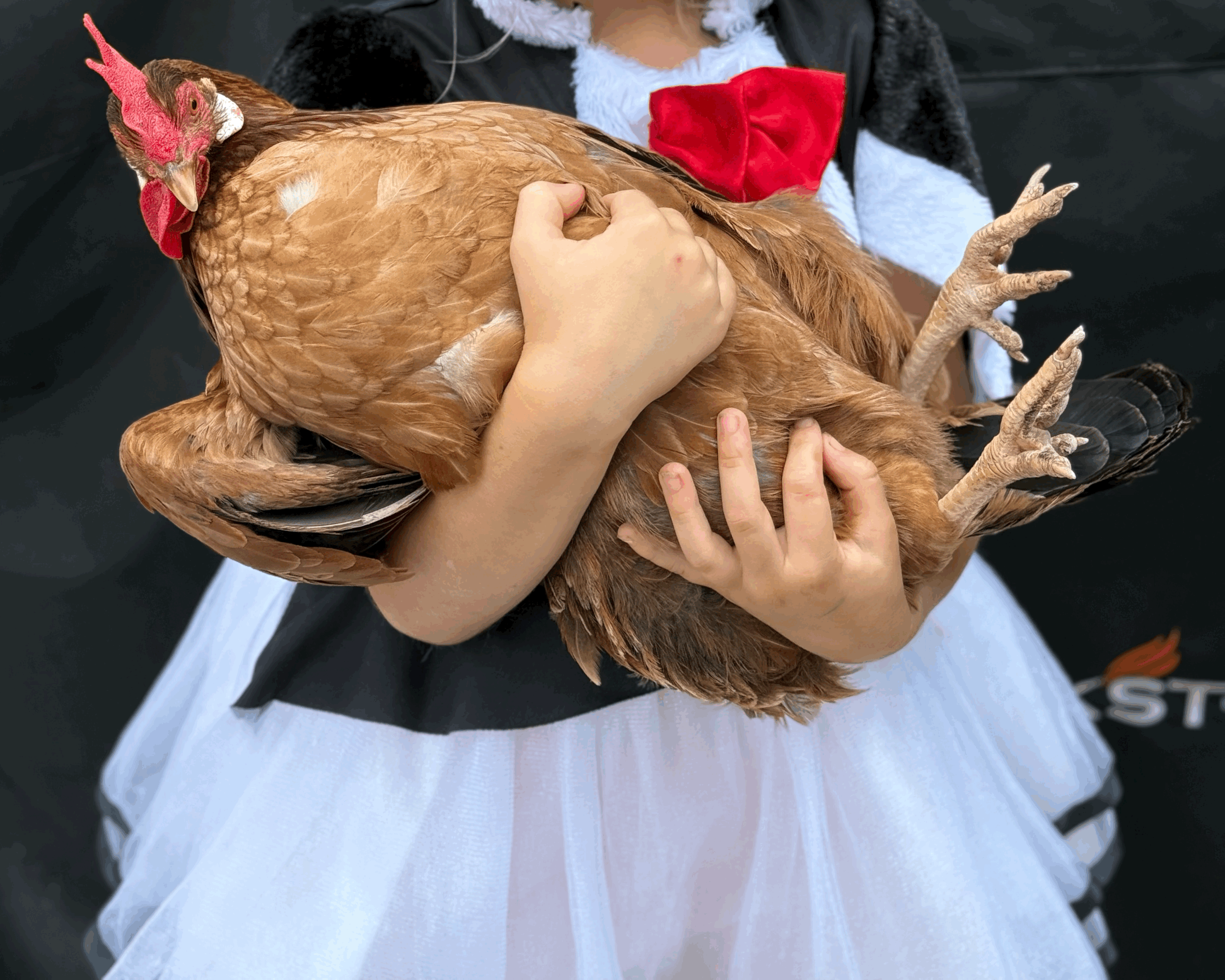 Like this chicken, I’m thinking, “The things I do for these kids…”